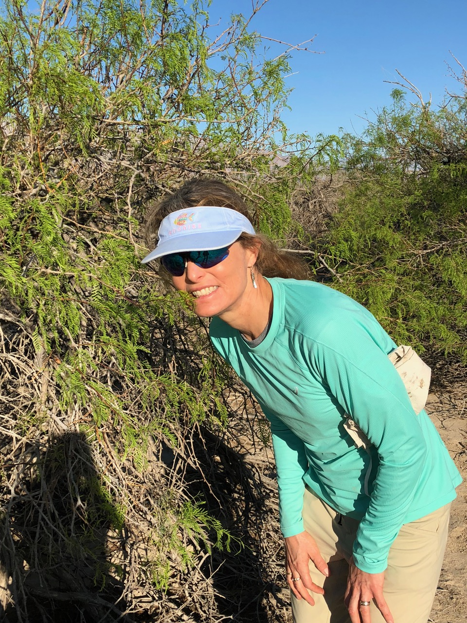 Photo: Dr. Denise Dearing understanding the life of the woodrats she studies by tasting a mesquite plant.