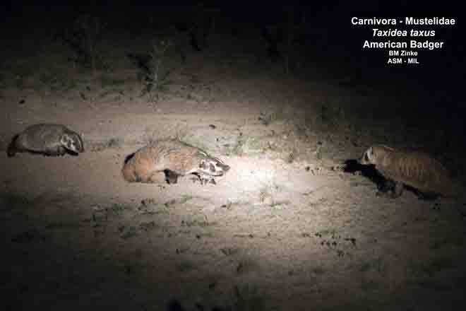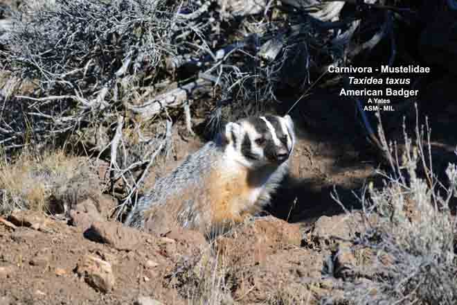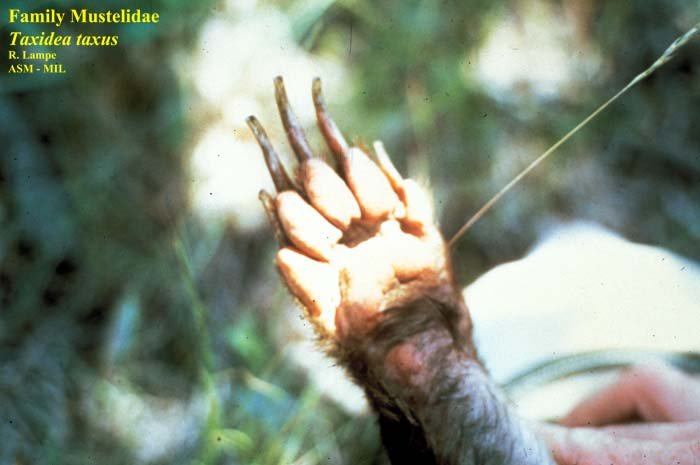 Because of their secretive and fossorial (digging) habits badgers are not often seen. Persecuted by humans, though sometimes inadvertently when taking poisoned meat meant for wolves and coyotes. Feet are large and clawed; specialized for digging.