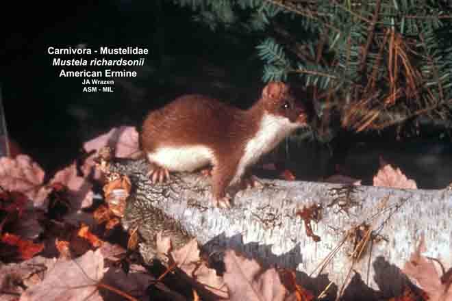 Color varies seasonally, white in winter. Mainly eats rodents and young rabbits, as well as small vertebrates and invertebrates. Nocturnal. Shriek loudly when attacking or is cornered. In Britain referred to as "stoat".
