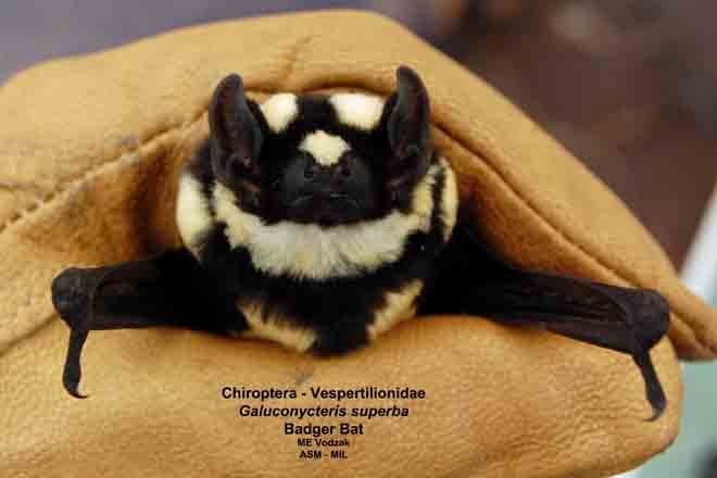 Front view of held animal. Formerly Niumbaha superba, Pied Butterfly Bat.