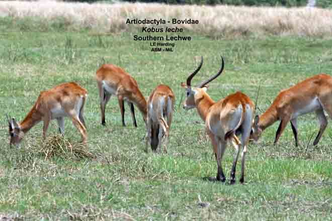 Five animals grazing, view of rump and tail. Also as Kobus leche, Red Lechwe.