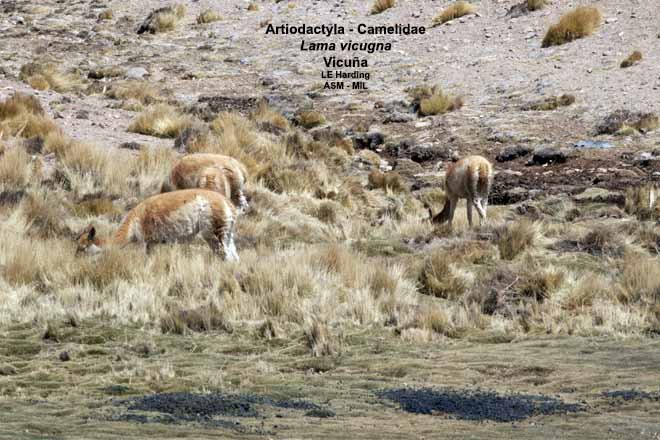 Group feeding in Altiplano with latrines visible in foreground. Formerly Vicugna vicugna.