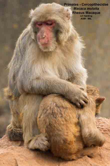 Adult female with infant. Also as Rhesus Monkey.