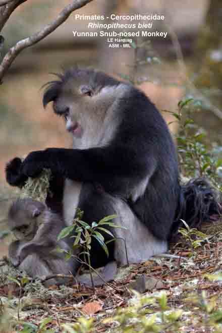 Adult female with infant, foraging on lichens. Formerly in Pygathrix. Also as Black Snub-nosed Monkey.