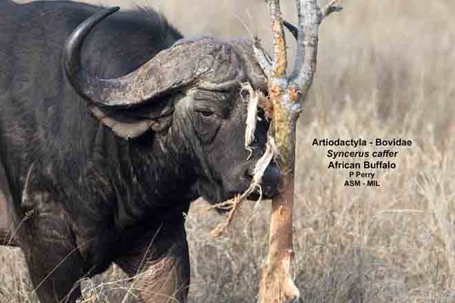 Tree rubbing with horns. Syncerus caffer caffer. Also as Cape Buffalo|Southern Savanna Buffalo.