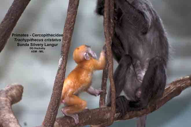 Adult female and infant. Also as Silvered Leaf Monkey|Silvered Monkey|Silvery Langur|Silvery Lutung.