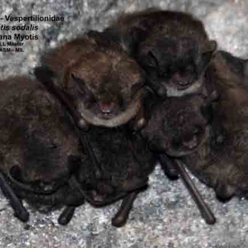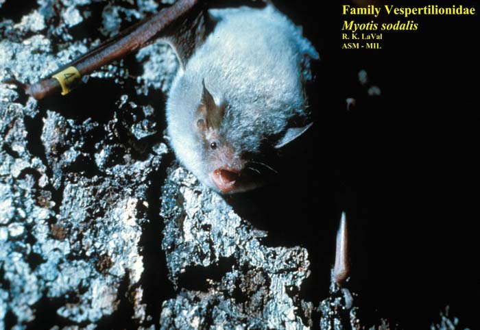 Federally endangered. Grayish-brown; hibernates in huge, isolated colonies.