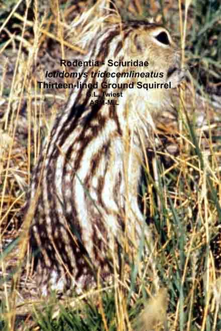 Nearly half the year may be spent in hibernation. Abundant along rights-of-way and roadsides. Hibernates up to six months. Small with (usually) 13 alternating dark (w/spots) & light stripes. Found in grassy or open wooded or shrubland.