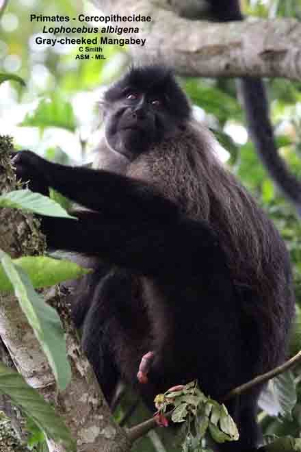 Lophocebus albigena ugandae, Ugandan Gray-cheeked Mangabey. Formerly Lophocebus ugandae, Ugandan Crested Mangabey. Also as Cloaked Mangabey|White-cheeked Mangabey.