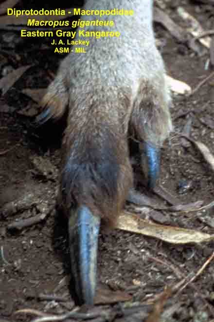 Close-up of hind foot planted on ground, showing all digits clearlyView of group feeding. Also as Eastern Grey Kangaroo.