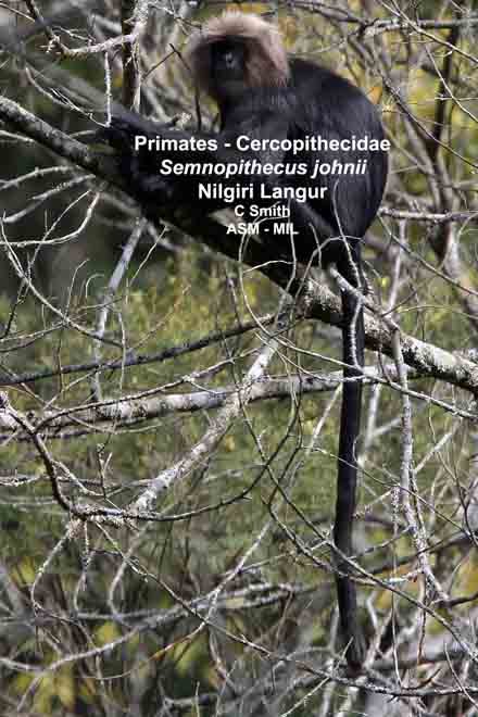 Formerly Trachypithecus johnii. Also as Black Leaf Monkey|Hooded Leaf Monkey|Indian Hooded Leaf Monkey|John's Langur|Nilgiri Black Langur|Nilgiri Leaf Monkey|South Indian Black Leaf Monkey. Identified by KP Karanth and KS Chetan Nag.